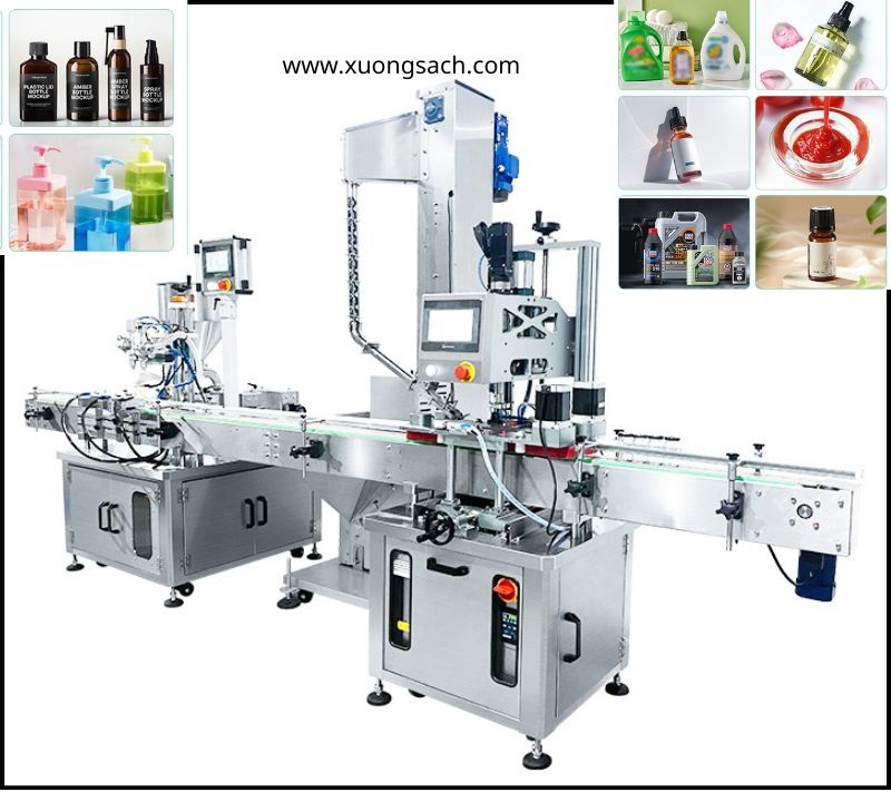 Máy chiết mỹ phẩm tự động có băng tải, vặn nắp chai
